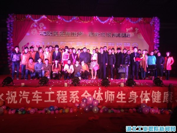 12月27日晚,汽车工程系2014元旦文艺晚会于院体育馆精彩上演。公司党委书记顾善远,经理魏文芳、经理助理郑强、学工处处长王哲,校企合作处长郑妍妍,后勤集团总经理刘堰兵以及兄弟系部领导莅临现场,与汽车工程系全体教职工一起,共同欣赏晚会。 晚会以“欢歌笑语辞旧岁,车轮滚滚向朝阳”为主题,在该系女生的开场舞《心电心》中拉开帷幕。晚会上还表演了《教师走秀》、小品《父母恩,比海深》、《雷人舞》、《B-box》和《明天会更好》等节目。