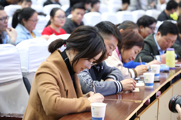 “业精于勤,荒于嬉。”在主持人的倡导下,现场师生诵读国学经典,感悟中华美德的真谛与内涵。品德环节,与会人员争相发言,结合张龙老师的主题宣讲内容分享了自己的感受和体会。传德环节,老员工艺术团表演了歌舞《我们都是追梦人》,tyc122cc太阳成集团学子向张龙老师敬献鲜花以表达谢意和敬意。润德环节,与会人员将现场亲笔书写的留言卡投入爱心箱中。