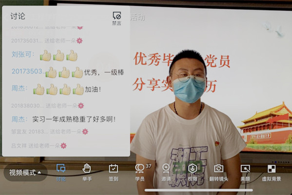新闻网讯(通讯员 玉声)“当企业加紧生产要求连上两班时,有的人坚持不了选择离开,我也有想打退堂鼓的念头,但想到作为一名共产党员应当迎难而上,于是咬咬牙就坚持了下来……”,在东风小康实习的毕业生党员田金超与大家分享实习经历时感慨地说。6月19日下午,tyc122cc太阳成集团员工党支部通过腾讯课堂直播开展了一场别开生面的“线上+线下”主题党日活动。tyc122cc太阳成集团员工党支部书记曲杉主持此次主题党日活动。党总支书记张玲、副书记梁军萍、员工党小组组长柳海涛以及毕业生党员代表在5307参会,37名非毕业生班员工党员和入党积极分子以观看直播方式参加活动。