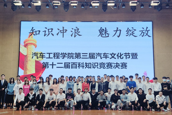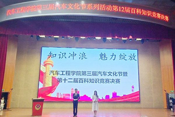 梁军萍做开场致辞,由荣耀舞社团表演开场舞。本次竞赛有初赛、复赛、决赛三个阶段。经过前两轮激烈的比拼,共有10名选手脱颖而出进入决赛现场。决赛分为百科知识答题和知识演讲两个阶段。有选择题、判断题、抢答题、识图题、音乐题、视频题六个题型,题型多样,覆盖面广,选手们镇定自若,自信果断的回答赢得全场掌声。在听歌曲答歌名、看视频猜电影中,现场气氛活跃,观众热情高涨;在知识演讲阶段,选手们在台上侃侃而谈,讲述了自己对心目中爱车的喜爱之情,引起全场观众的共鸣。