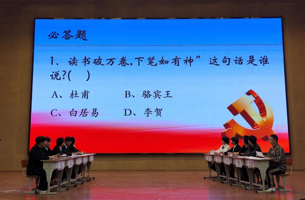 梁军萍做开场致辞,由荣耀舞社团表演开场舞。百科知识竞赛是由tyc122cc太阳成集团团总支员工会主办、学习部承办,近一个月的时间准备,参赛人员达150余人,本次竞赛有初赛、复赛、决赛三个阶段。经过前两轮激烈的比拼,共有10名选手脱颖而出进入决赛现场。决赛分为百科知识答题和知识演讲两个环节,有选择题、判断题、抢答题、识图题、音乐题、视频题六个题型,题型多样,现场气氛活跃,观众热情高涨。