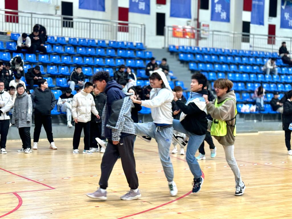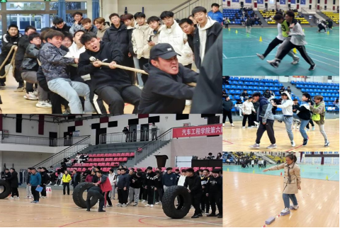 此次趣味运动会共设有7个项目,其中男生以班级为单位参加团体赛“车轮滚滚”、“齐心协力”、“和谐号”、“拔河”项目,女生参加个人赛“摸石头过河”、“踢毽子”、“跳绳”项目。尽管比赛当天室外下着又密又细的冬雨,但却阻挡不了体育馆内同学们的热情。参赛队员们个个精神饱满,奋力拼搏,拉拉队的同学大声呐喊助威,跃跃欲试。
