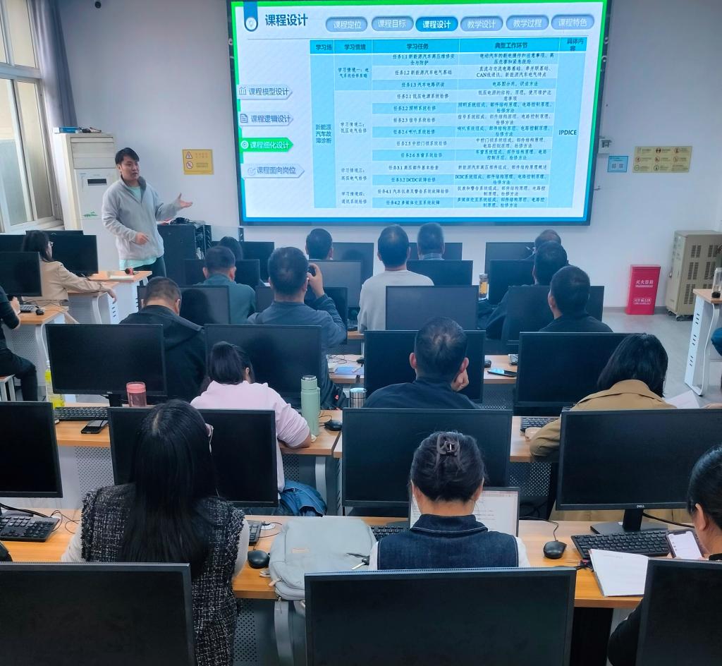 十位教师依次汇报课程设计后,专家与观摩教师逐一点评,提出中肯意见与改进建议。胡盛骑教授以《汽车发动机检修》课程为例,逐步拆解工作过程系统化课程的实施路径,使抽象标准变得直观可感。莫足琴主任强调课程设计应立足职业教育实际,突出“岗课赛证”综合育人特色。张建教授鼓励教师持续学习先进职教理念,确保课程设计科学正确。