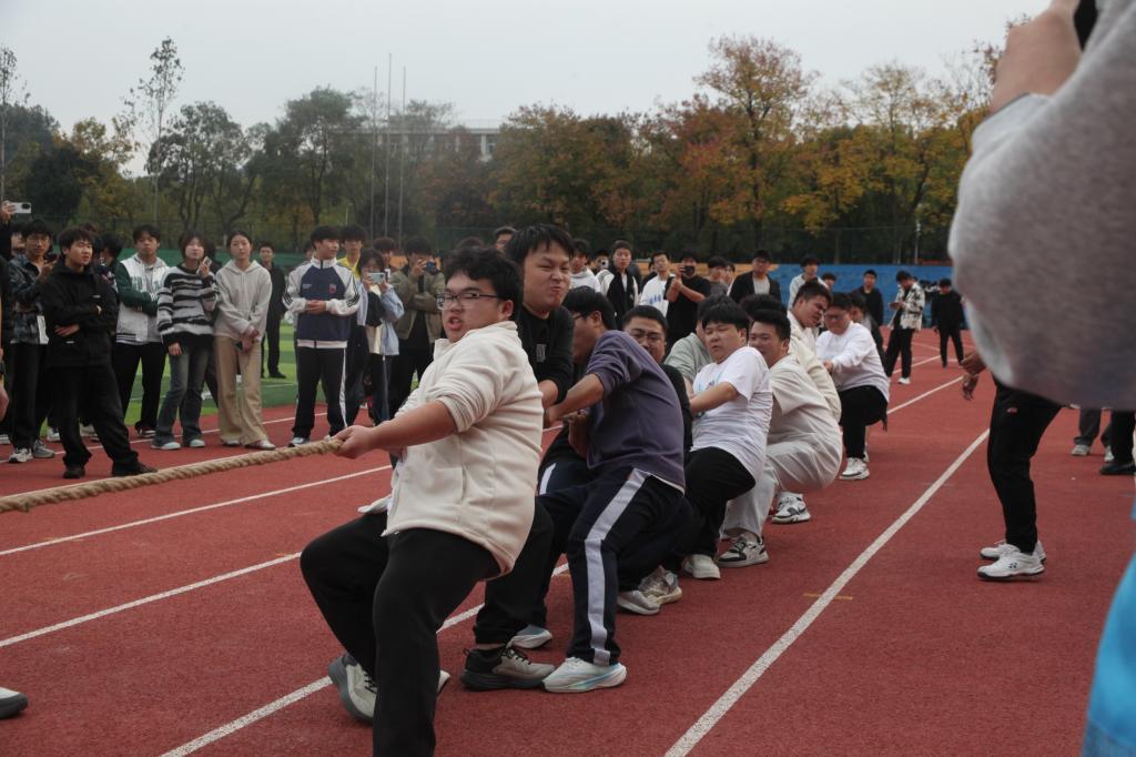 提前一周开启的拔河预赛,经多轮激烈厮杀,最终两支劲旅脱颖而出,让拔河决赛成为整场运动会的“压轴大戏”。哨声一响,队员们瞬间绷紧身躯,双手如铁钳般扣紧麻绳,腰背弓成一张弓、重心稳稳后沉,绳上红线在拉扯间剧烈摇摆,迟迟难分胜负。场边同学们 “加油” 声浪一波盖过一波,连在场教师都忍不住起身鼓劲,队员们更是咬牙坚持,展现出出色的团队合作与不轻言弃的竞技精神,全场氛围在此刻彻底燃爆。
