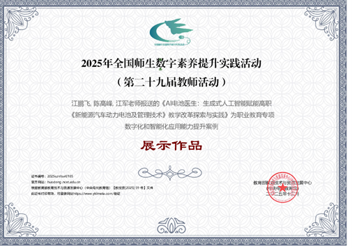 (通讯员高燕)在刚刚结束的2025年全国师生数字素养提升实践活动职业教育专项评选活动中,公司报送的案例成功入选“职业教育数字化和智能化应用能力提升案例展示作品”。此次活动图文信息中心积极组织,共征集3个案例,其中江鹏飞、陈高峰、江军三位教师共同完成的《AI电池医生:生成式人工智能赋能高职〈新能源汽车动力电池及管理技术〉教学改革探索与实践》获评为展示作品。这一成果不仅是对公司一线教师数字化教学创新能力的权威认可,更是公司深入贯彻国家教育数字化战略、推动“数智融合”在职业教育领域落地生根的生动实践。
